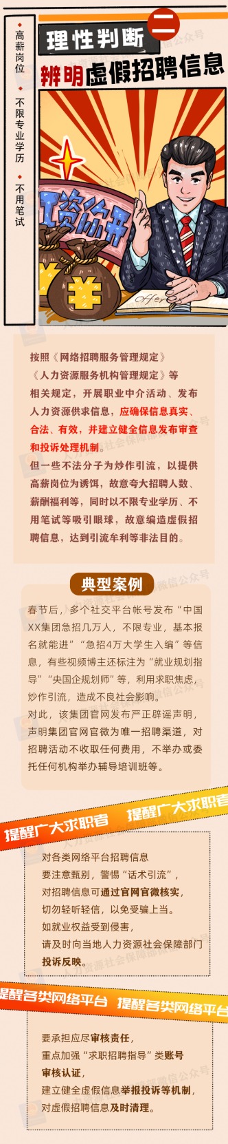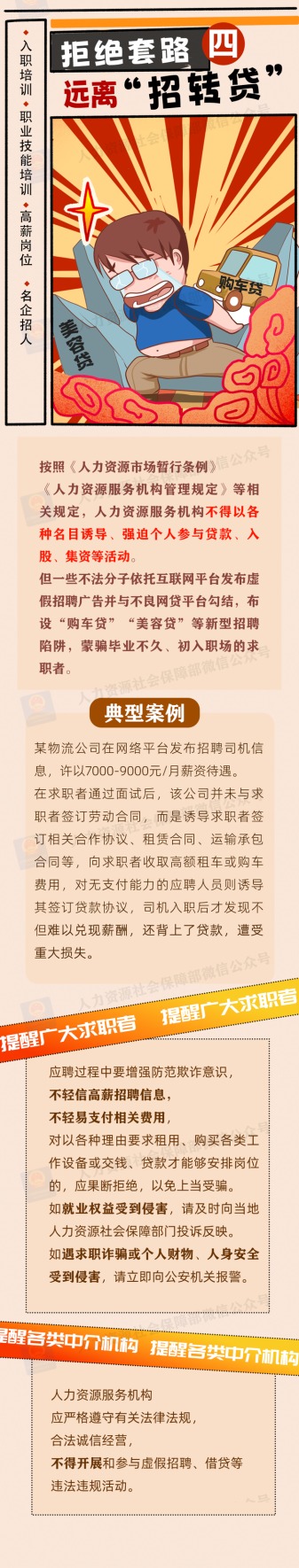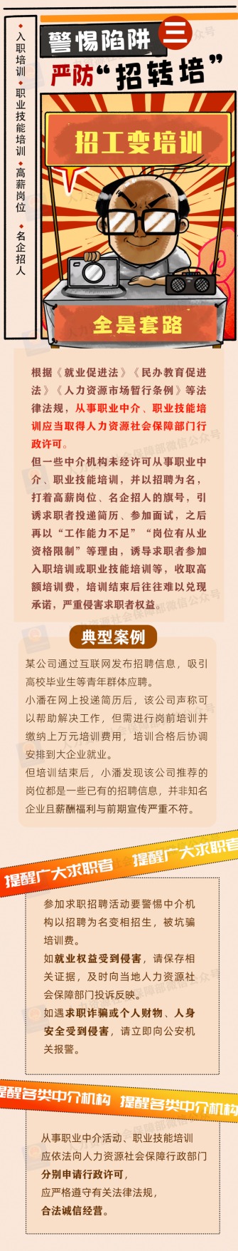 为加强风险防范,人力资源社会保障部、中央网信办、教育部联合发布招聘欺诈典型案例,揭示不法分子的惯用手法和话术套路,帮助高校毕业生等广大求职者提高风险识别意识,增强自我保护能力。